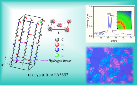 貴大新聞網訊(材料與冶金學院)近日,我校材料與冶金學院劉玉飛特聘教授團隊在生物基聚酰胺材料研究領域取得重要突破,相關成果以 Biobased Polyamide 5652 with α?Crystal Form: Characterization and Low Moisture Absorption為題,發(fā)表于高分子領域頂級期刊Macromolecules(自然指數(shù)期刊,中科院一區(qū)TOP)。貴州大學材料與冶金學院為論文第一完成單位,材料與冶金學院2022級碩士研究生王艷平為第一作者,劉玉飛特聘教授為通訊作者。近年來,生物基聚酰胺56(PA56)因其原料可再生、低碳環(huán)保而備受關注,但其特殊的分子結構(戊二胺單元含奇數(shù)碳原子)導致其晶體通常以γ晶型為主,飽和吸水率高達12%以上,在潮濕環(huán)境中力學性能顯著下降(如拉伸強度降低20%-30%),嚴重限制了在精密工程領域的應用,而傳統(tǒng)改性方法往往以犧牲材料其他性能為代價。針對這一難題,劉玉飛特聘教授創(chuàng)新性地提出了雙氫鍵結構調控策略:自主合成關鍵單體,設計并成功合成新型565二胺單體(C16H34N4O2),將565二胺與草酸二丁酯通過溶液聚合及